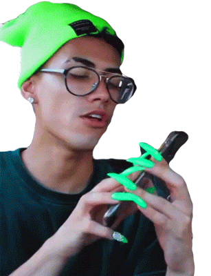 Giovanni Rivera, wearing a neon green beanie and nails, reacts while looking at his phone.