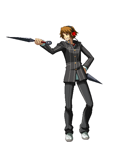 Yosuke Hanamura from Persona 4, in his school uniform, prepares to attack with a kunai weapon.