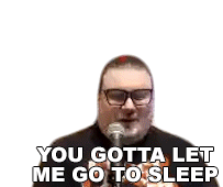 Celticcorpse, holding a microphone, pleads to be allowed to go to sleep, looking tired and weary.