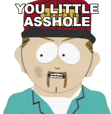 a cartoon character with a hat that says " you little asshole " on it