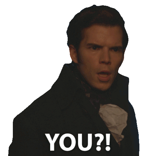 Luke Newton as Colin Bridgerton looks surprised and points, with the text 'YOU?!' appearing. A questioning reaction.