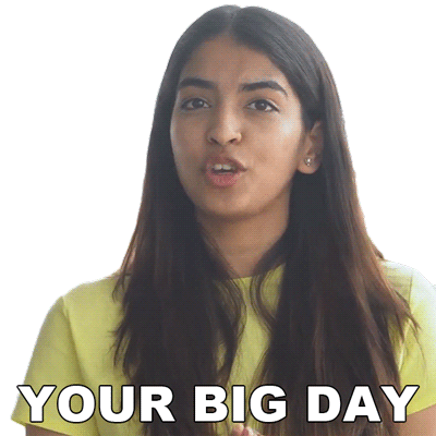 a woman in a yellow shirt is making a funny face and says " your big day "