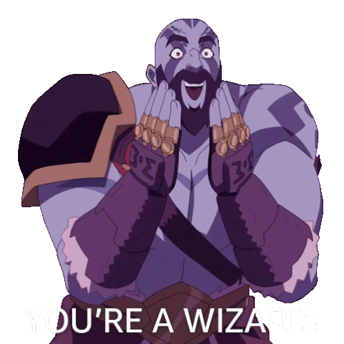 Grog Strongjaw from The Legend of Vox Machina reacts with wide-eyed surprise and joy, exclaiming 'You're A Wizard!'