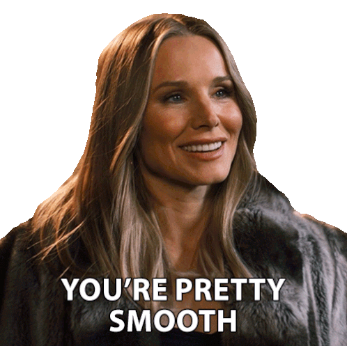 Kristen Bell as Joanne, wearing a fur coat, delivers the line 'You're Pretty Smooth' with a subtle smile.
