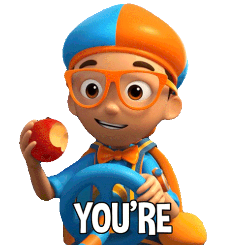 Blippi, the beloved children's character, smiles and gives a positive affirmation, saying "You're Right" while holding an apple and a steering wheel.