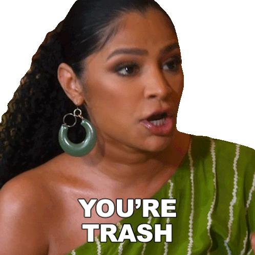 Clayanna Warthen from Basketball Wives emphatically declares 'YOU'RE TRASH' with a stern expression, perfect for expressing disapproval.