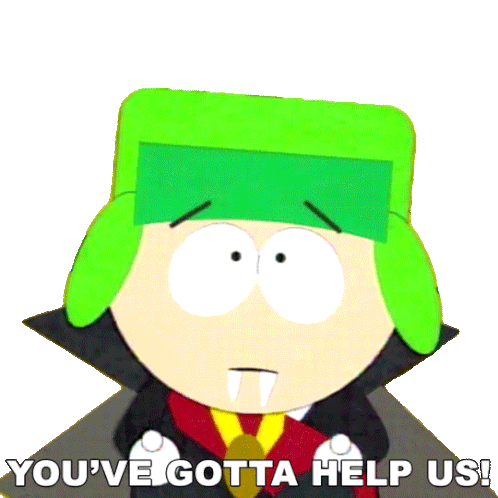 Kyle Broflovski from South Park, dressed as a vampire, urgently says "You've gotta help us!"