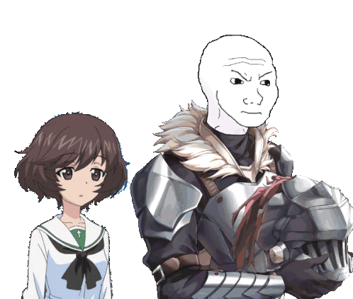 Yukari Akiyama from Girls und Panzer stands beside a knight character, resembling Goblin Slayer, who has a distressed Wojak meme face and holds a helmet.