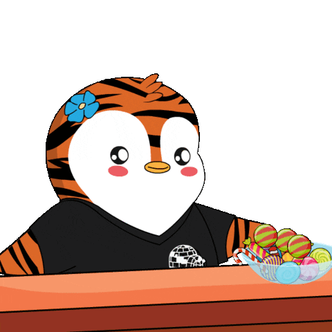 A cute Pudgy Penguin with tiger stripes and a blue flower looks at a bowl of colorful candies, ready for a sweet treat.