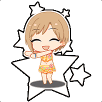 Animated sticker of Yumi Aiba from Cinderella Girls, happily posing in a swimsuit with a colorful beach ball.