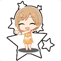 Chibi Yumi Aiba from Idolmaster, happily stirring a bowl of chocolate, surrounded by stars. A cute animated sticker.