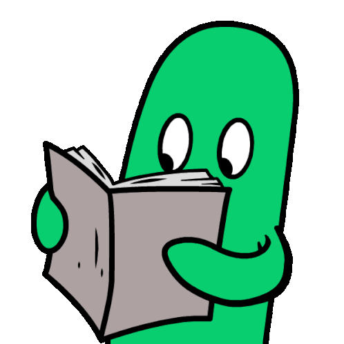 A green cartoon character from Yupforreal is deeply absorbed in reading a book, showing focus and curiosity.