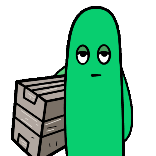A green, blob-like character with half-lidded eyes looks tired and bored while holding a clipboard and boxes.