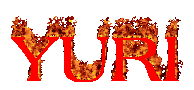 The word 'Yuri' is displayed in bold red letters, engulfed in animated flames, creating a dynamic burning text effect.