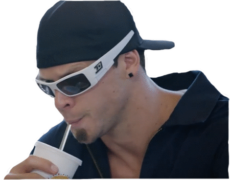 a man wearing a black hat and white sunglasses drinks from a cup with a straw
