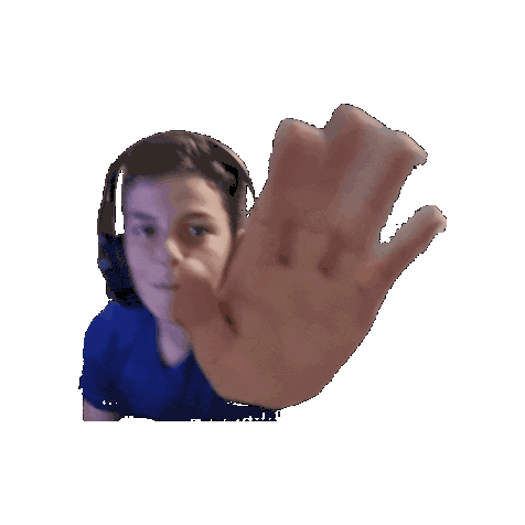 Zander wearing headphones makes a stop gesture with his hand, looking directly at the viewer.