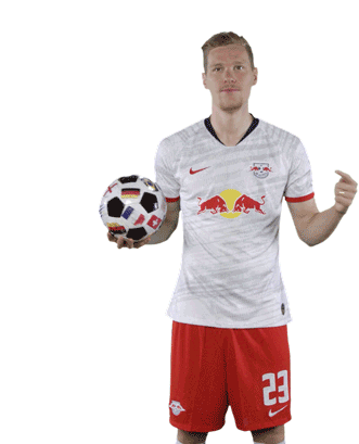 Marcel Halstenberg, a football player, points to his RB Leipzig jersey and the football he is holding.