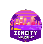 A pixel art logo for Zencity Roleplay, featuring a city skyline with palm trees and a vibrant purple and pink color scheme, rotating.