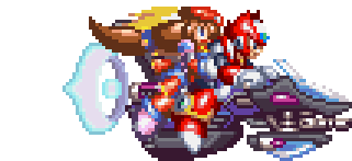 Pixel art sticker featuring Mega Man characters Zero and Iris on a futuristic ride, with Zero firing an energy blast.