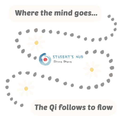 Animated sticker illustrating the flow of Zhineng Qigong energy, showing a dotted path where the mind goes, with flowers blooming.