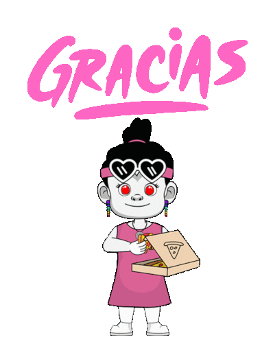 a cartoon girl holding a pizza box with the word gracias written above her