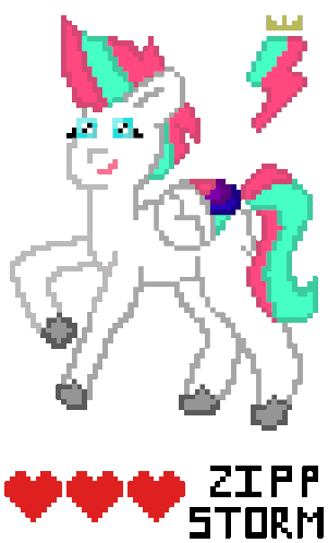 Zipp Storm, the My Little Pony character, depicted in vibrant pixel art as a winged unicorn with hearts.
