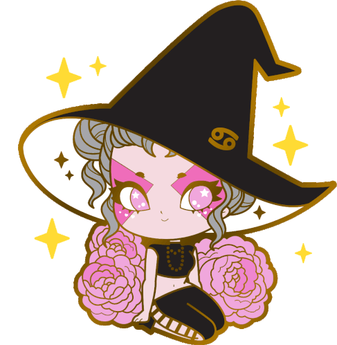 A cute Cancer zodiac witch with pink accents, a black hat, and sparkling stars, featuring a magical and kawaii aesthetic.