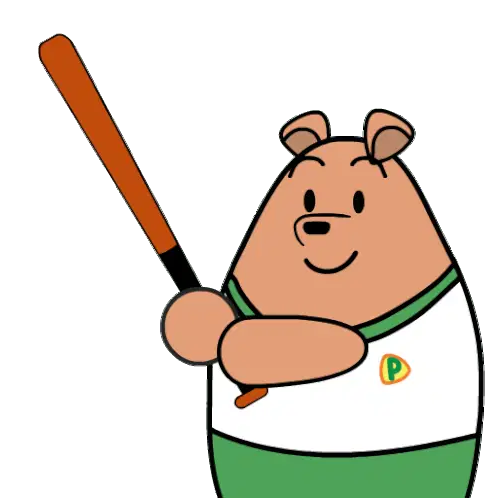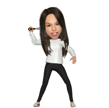 A cartoon-style zomoji avatar with a large head, long dark hair, holding a baseball bat in a batting stance.