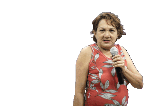 Zuzu, a woman in a red floral top, points at the viewer while holding a microphone and singing.