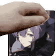 a hand is holding a picture of a girl with purple hair and a black jacket .